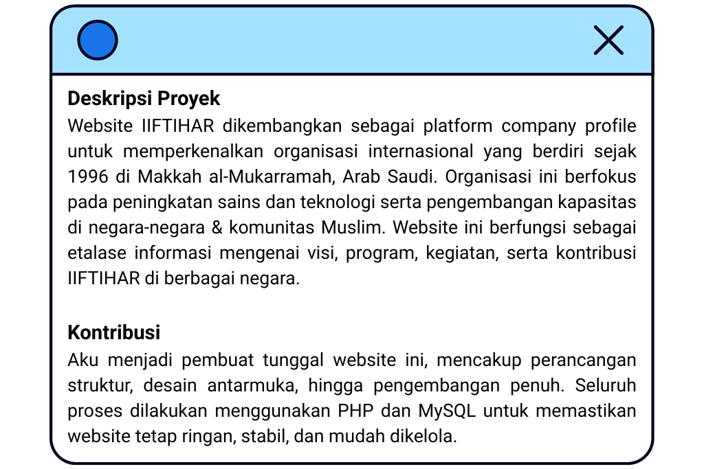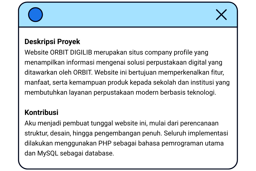 Dari sekian banyak cerita kerja, Orbit itu beda. Semua terasa pas. Mulai dari bikin website, bangun tim tech, ngerjain proyek digital bareng, sampai pelatihan web & app, semua jalan kayak puzzle yang ketemu tempatnya. Di sini aku nggak cuma kerja, tapi berkarya. Aku belajar banyak hal, ketemu klien dari sekolah sampai perusahaan, ngobrol langsung, ngasah komunikasi, dan ngerasain langsung jadi bagian dari perubahan. Lingkungannya suportif, timnya solid, dan Leader-nya inspiratif. Rasanya, dari awal semesta kayak udah dorong aku ke sini. Di Orbit, aku diterima, dihargai, dipercaya dan aku nggak mau menyia-nyiakan itu. Terima kasih, Orbit. Tempat ini bukan cuma tempat kerja, tapi titik balik terbaik dalam hidup profesionalku.